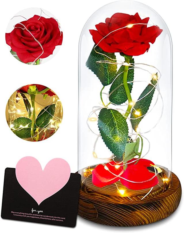 - ЧЕРВОНА РОЗА У СКЛІ: включає червону шовкову троянду, світлодіодну стрічку, пелюстки, високоякісний скляний купол, дерев'яну основу. Він також покритий блискучим та міцним скляним куполом, щоб захистити квітку та зберегти її назавжди.